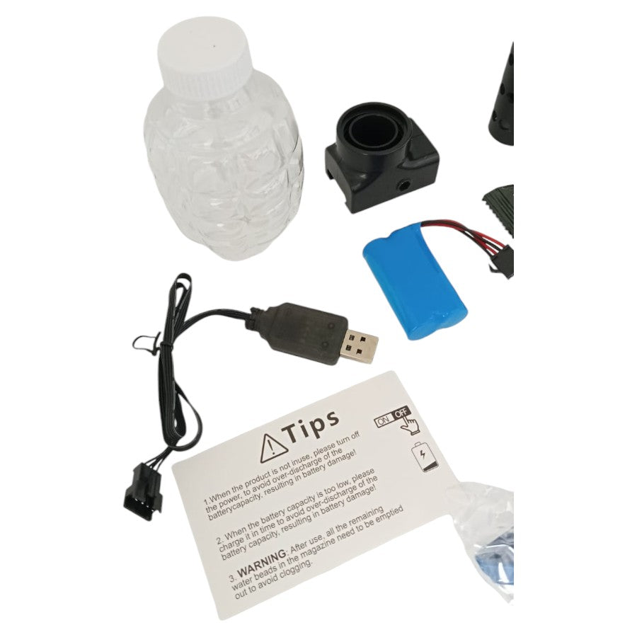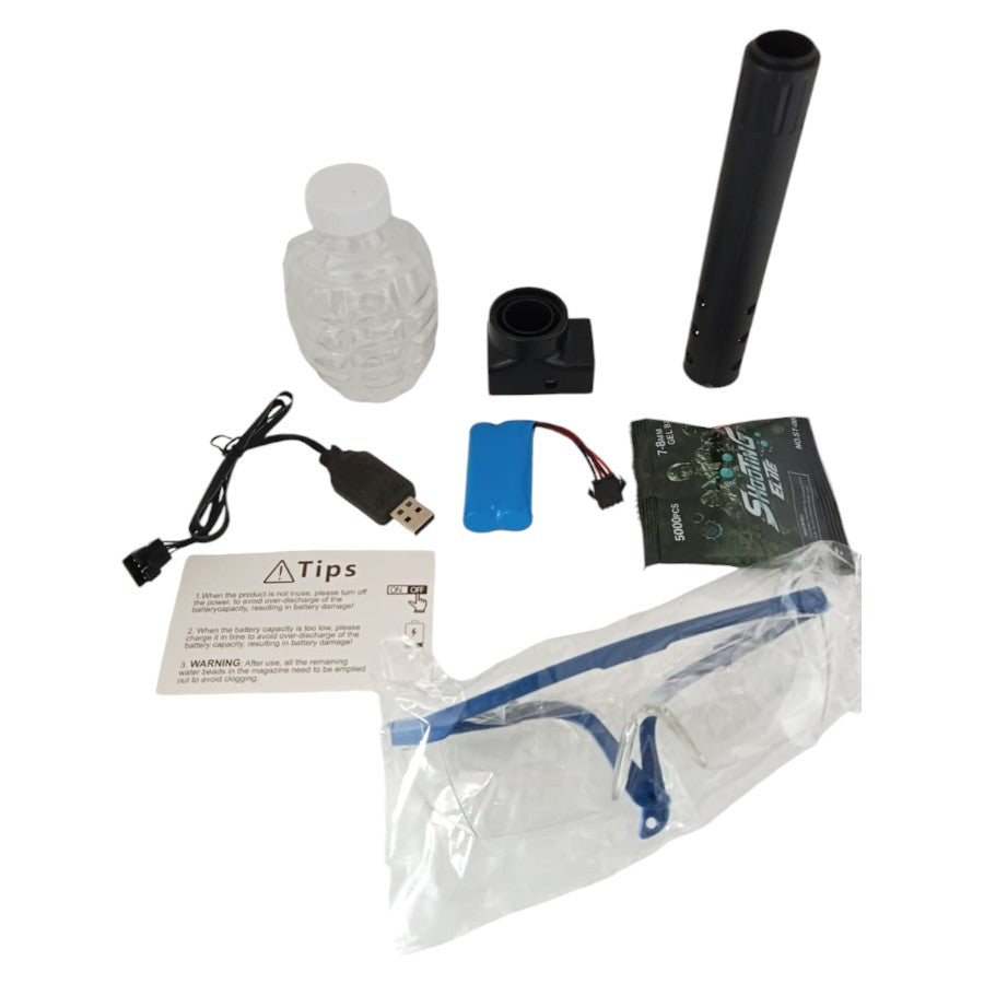 - Incluye gafas de protección, batería recargable, cable USB para cargar y un paquete de geles de agua.
