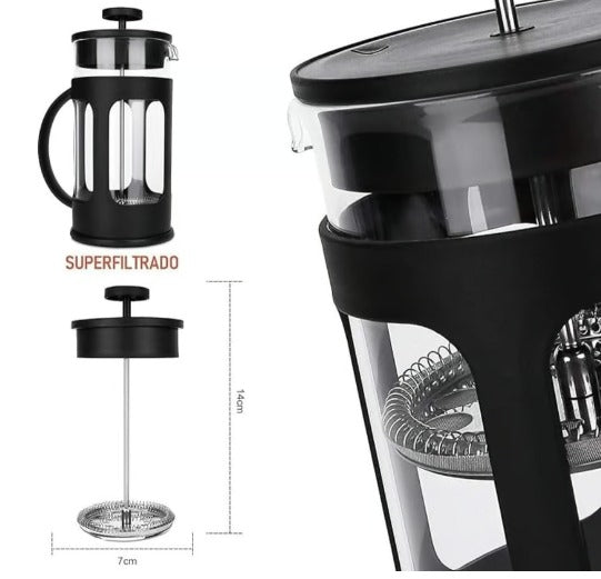 Cafetera francesa de vidrio con soporte de polipropileno resistente a altas temperaturas y filtro de acero inoxidable (contiene instrucciones de uso).