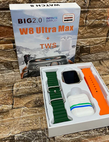 Este increíble producto incluye 1 Reloj SmartWatch de ultima generación W8 Ultra Max de alto rendimiento, tambien unos auriculares inalámbricos de excelente calidad TWS con su caja power bank Tipo C y adicional se te incluye un pulso de obsequio para que intercambies la apariencia de tu reloj según tu atuendo